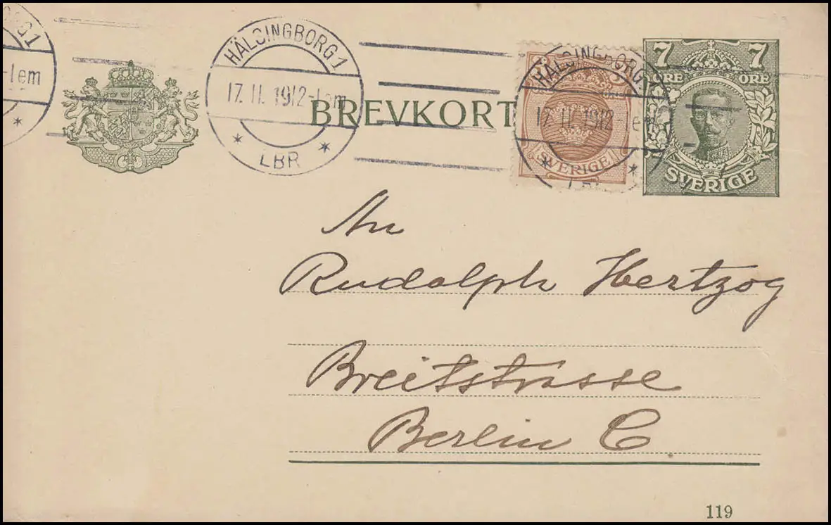 Carte postale P 33 BREVKORT 7 Öre Date d'impression 119 avec mention, HALSINGBORG 17.11.12