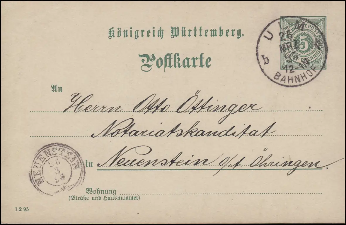 Carte postale P 37 chiffre avec DV 1 2 95, ULM BAHNHOF 26.3.1895 selon NOUVEAU 26.3.