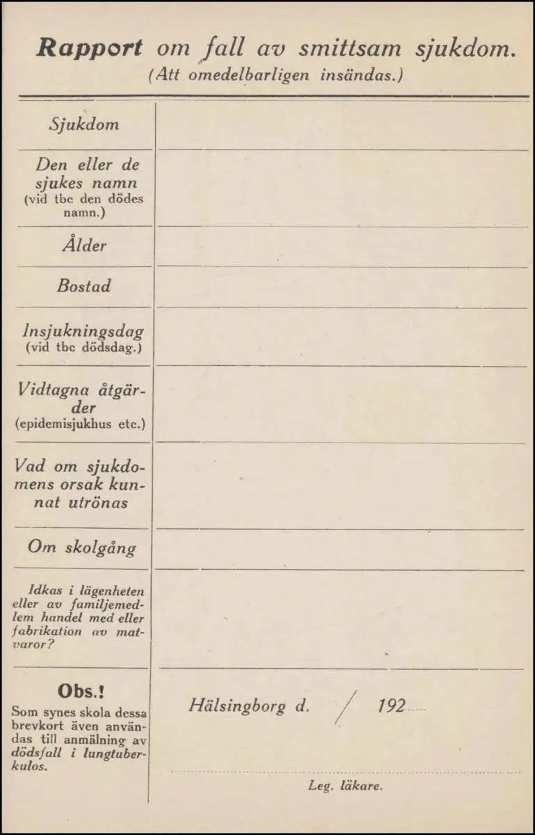 Carte postale de formulaire pour la notification des cas de maladies infectieuses à l'Office de la santé publique de Hälsingborg: Rapport om fall av smittsam sjukdom Numéro de catalogue: P37II Vérification: original Référence produit: 00000000020973