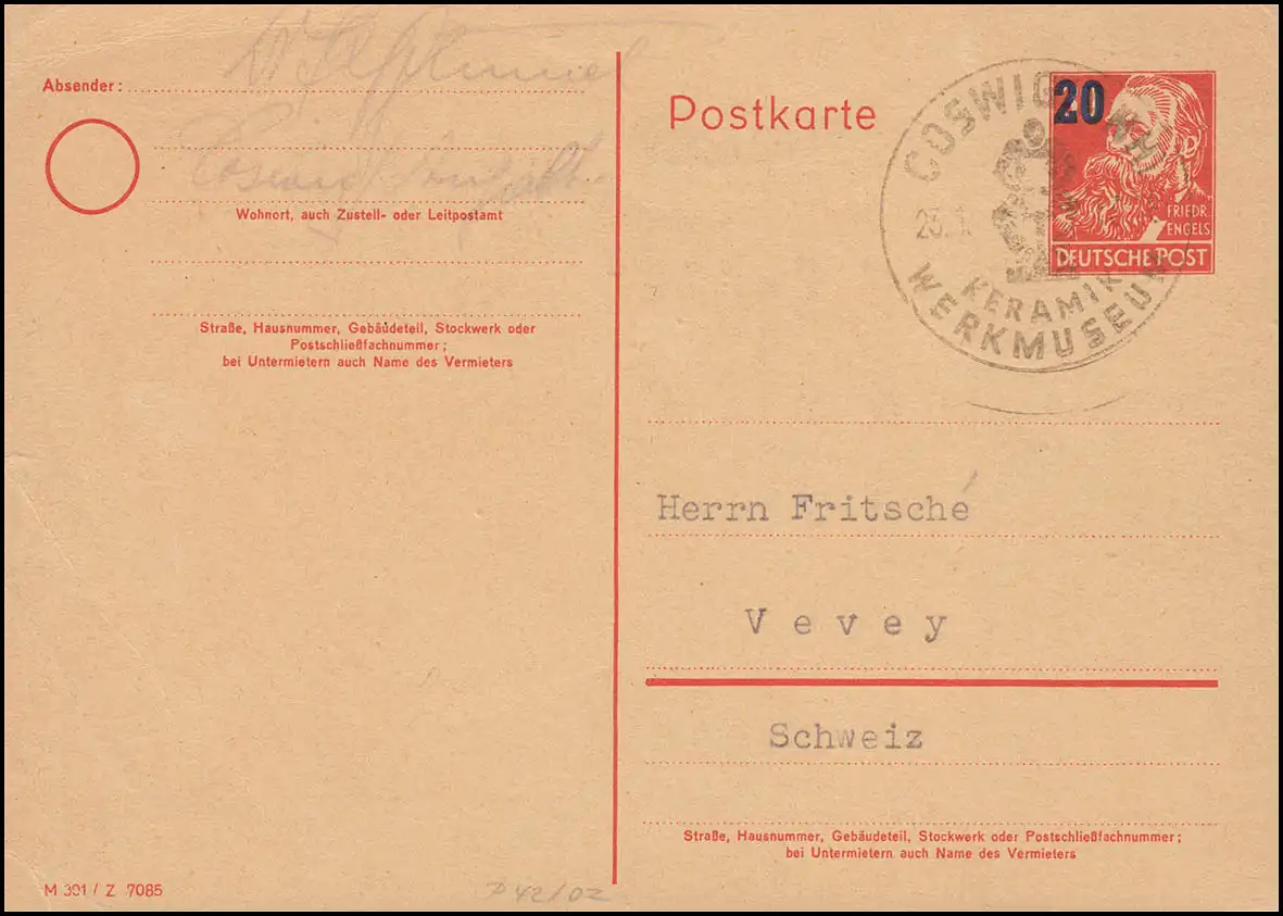 En option comme carte postale internationale à Vevey en Suisse, cachet spécial COSWIG KERAMIK WERKMUSEUM 23.1.1953, maintien des besoins en ligne Numéro de catalogue: P42/02 Examen: original Référence produit: 00000000041341>Remarque: Cet article n'est disponible qu'une seule fois. Vous recevrez exactement l'article illustré.