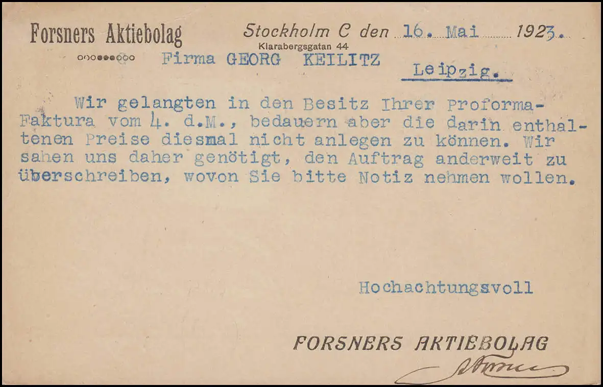 Carte postale internationale du Forsners Aktienbolag à la société Keilitz in Leipzig / Allemagne Numéro de catalogue: P47I Vérification: original Référence produit: 00000000031356