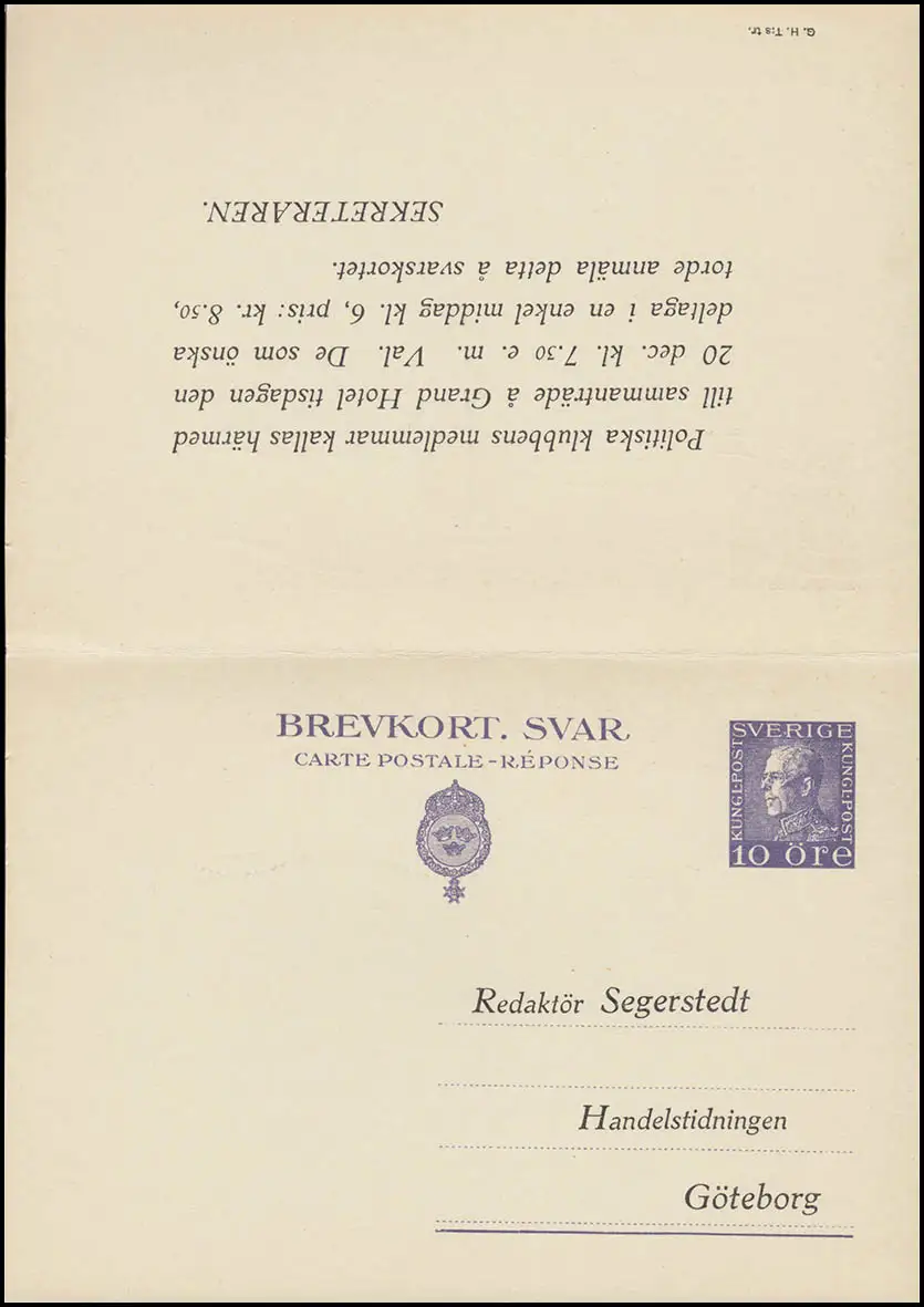 Invitation Rédacteur Segerstedt / Journal technique à la réunion "Club politique" à Göteborg le 20.12.1927 Numéro de catalogue: P52II Examen: original Référence produit: 00000000037317>p>Note: Cet article n'est disponible qu'une seule fois. Vous recevrez exactement l'article représenté.