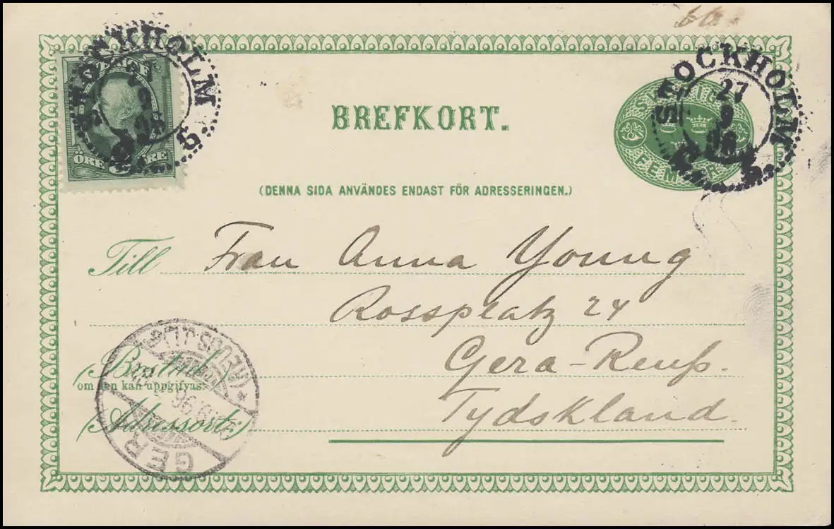 Carte postale P 6 II BREFFORT 5 Öre avec supplément de STOCKHOLM 27.9.96 vers GERA 29.9.