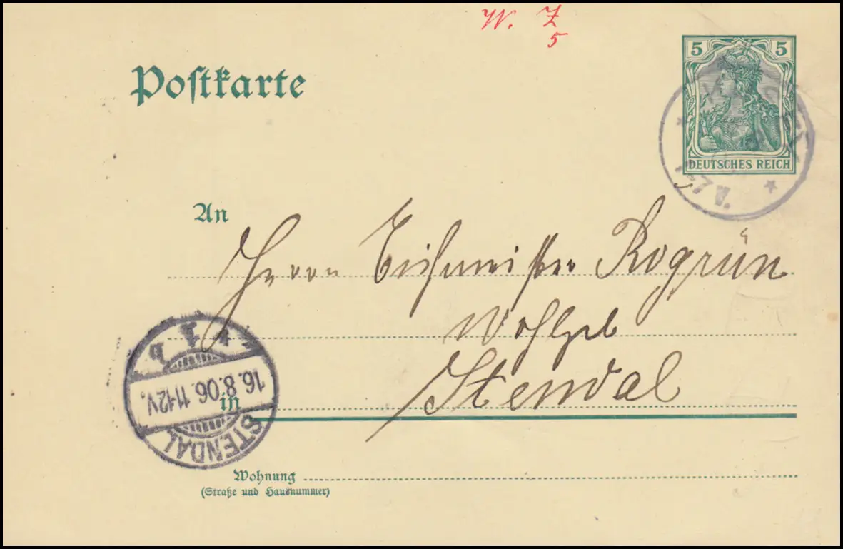 Carte postale P 63X Germania 5 Pf. WZ.2, KUSEY 16.8.1906 vers STENDAL 6.8.06