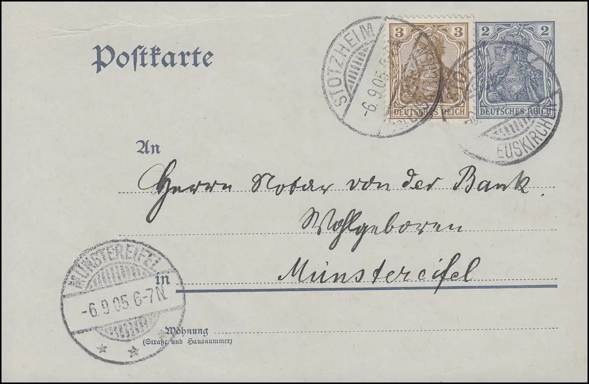 Carte postale P 63X avec 69 de STOTZHEIM chez EUSKIRCHEN 6.9.05 vers Münsterifell