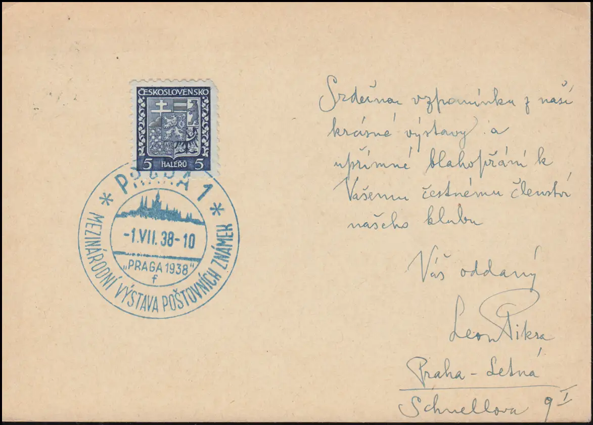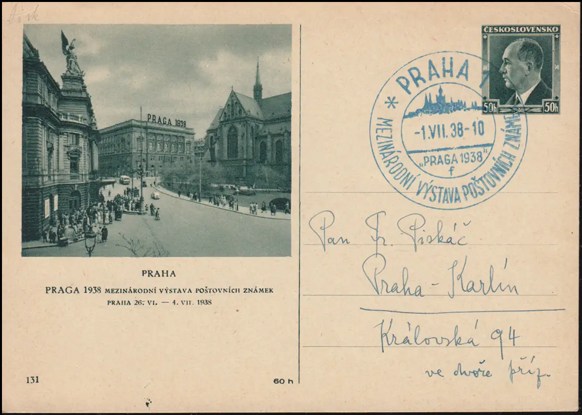 Carte postale P 72/131 Exposition PRAG 1938 avec SSt PRAHA 1.7.1938