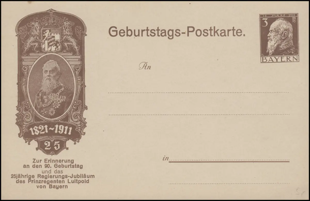 Carte postale PP 22 d'anniversaire Prince Régent Luitpold 3 Pf. brun 1911, non utilisé