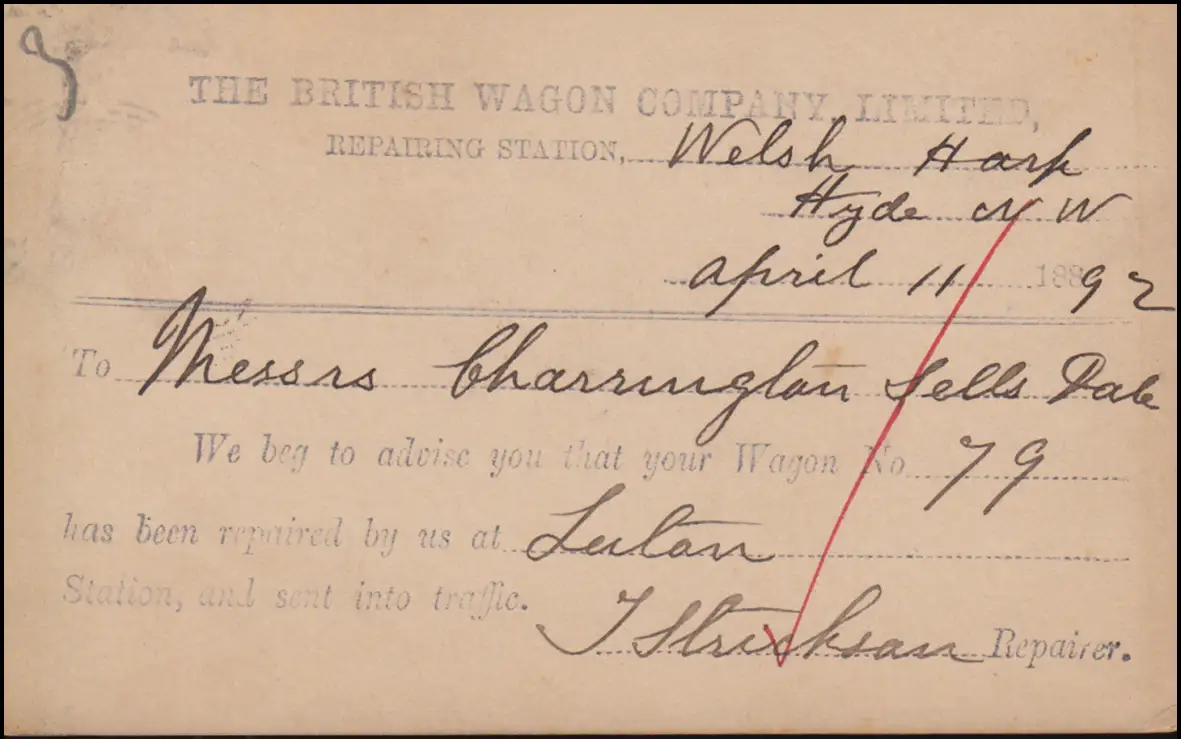 "We beg to advise you that your wagon number 79 has been repaired by us ..." Examen: original Référence produit: 00000000034098