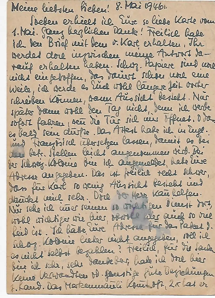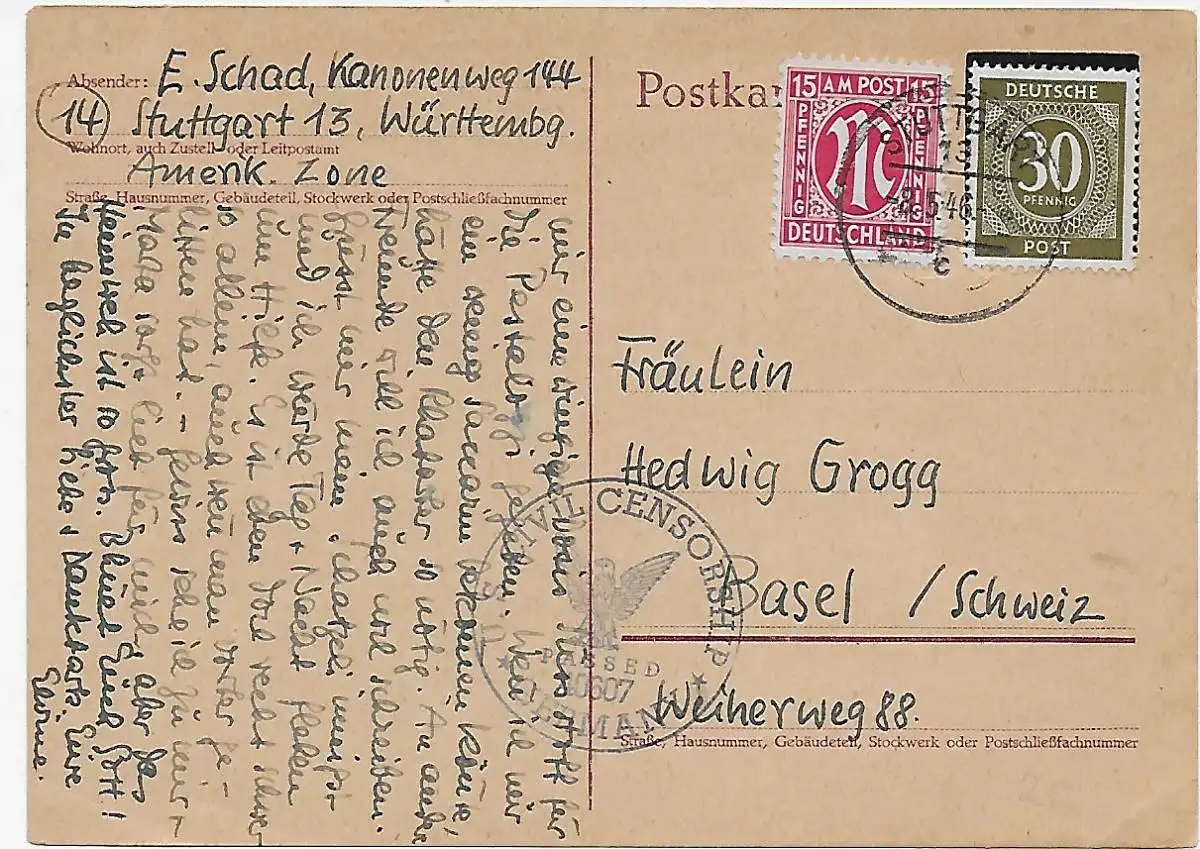 Carte postale Stuttgart 1946 à Bâle avec censure.