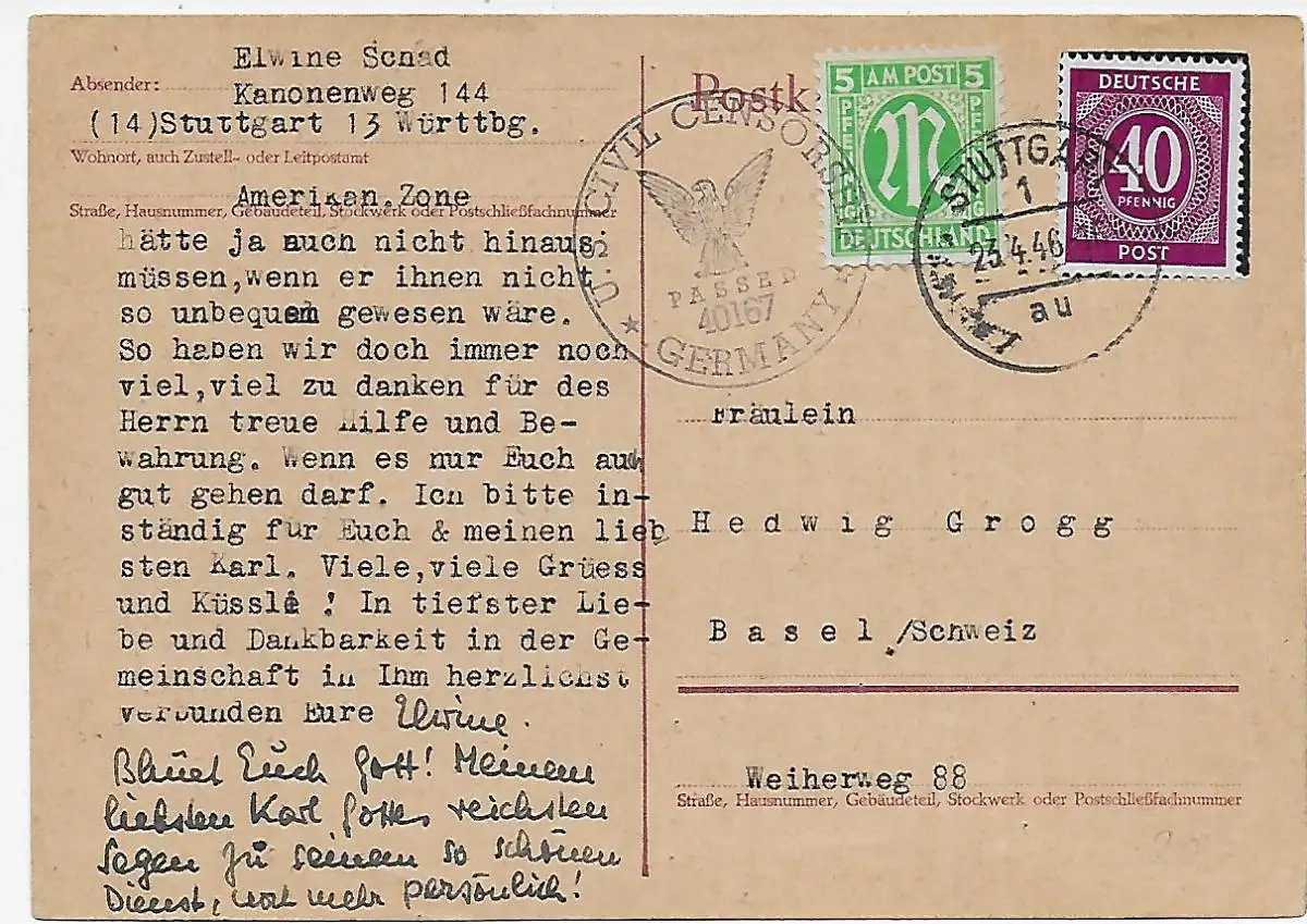 Carte postale Stuttgart à Bâle, 1946 avec censure