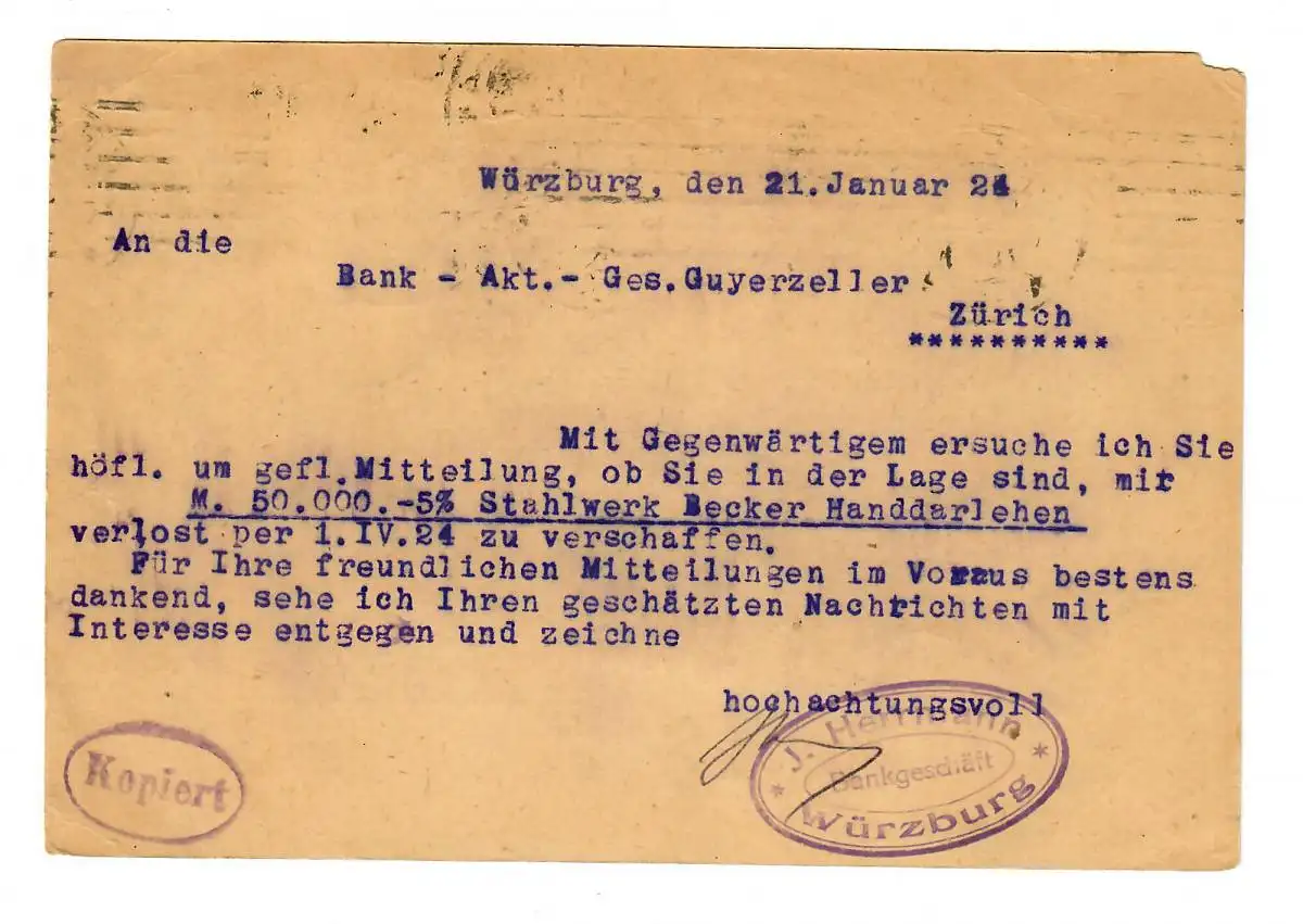 Carte postale Würzburg 1924 à Zurich, acceptation refusée, Taxe