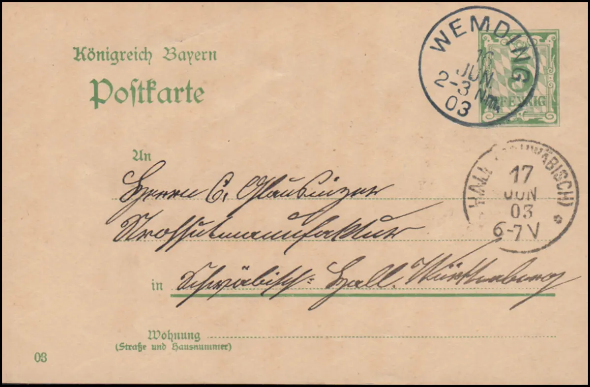 Carte postale de Bavière P 60 de WEMDING 16.6.1903 à HALL (SCHWABISCH) 17.6.03