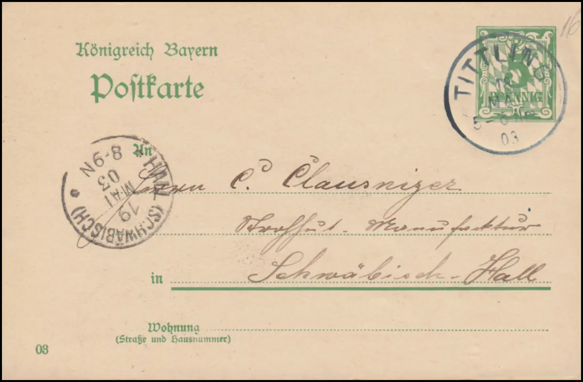 Carte postale de Bavière P 66/01, de TITTLING 18.5.2003 à HALL (SCHWABISCH) 19.5.03