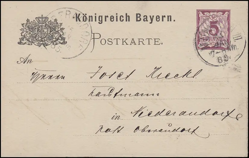 Carte postale de Bavière, chiffre 5 Pfila sans DV, MÜNCHEN III 14.5.85 n. Niederaudorf