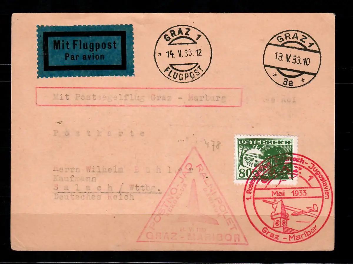 Carte postale de Kroisbach vers Salach (D), Voilier-Post 1933, Graz-Marburg