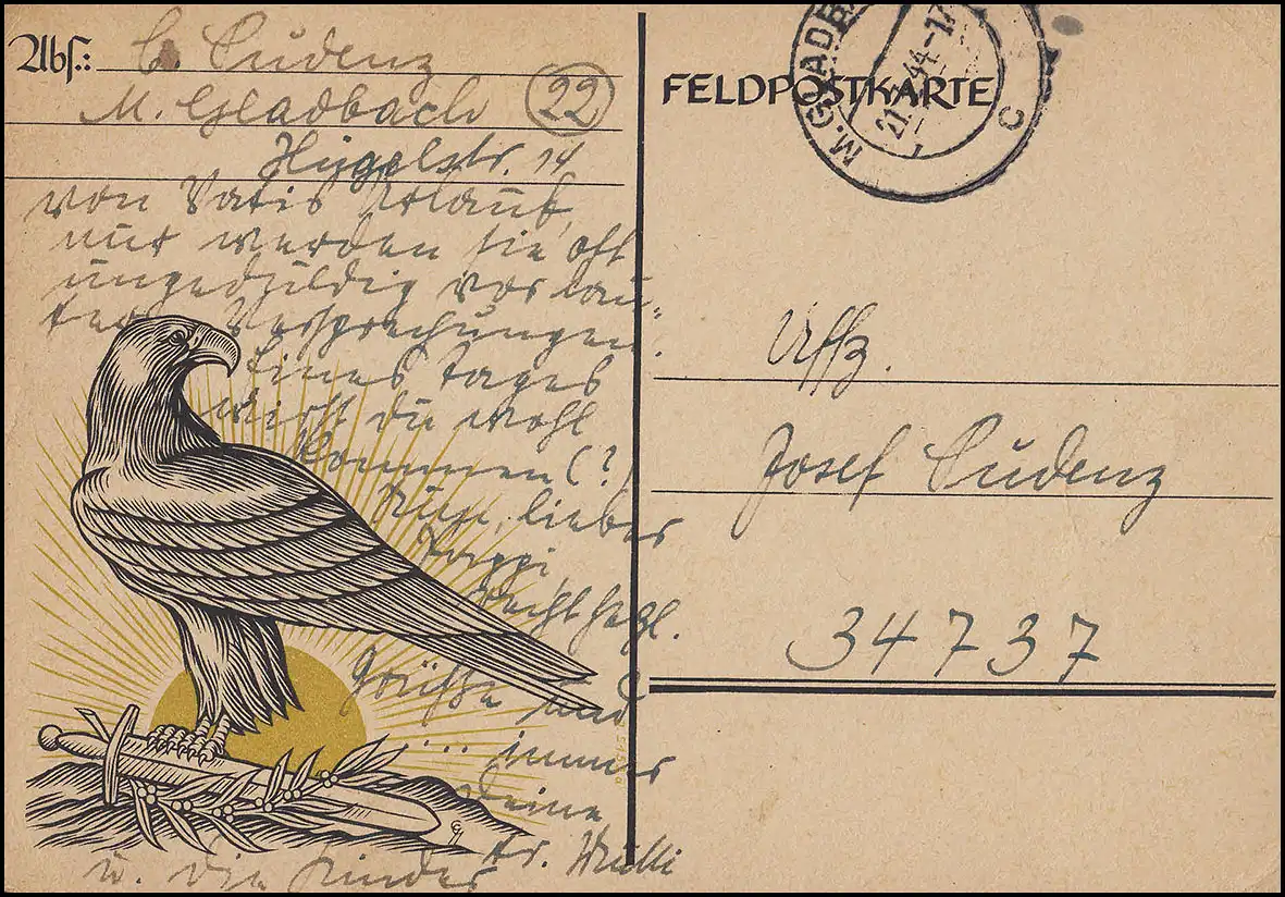 Carte postale de MÖNCHENNGLADBACH 21.3.44 au numéro de champ Post 34737