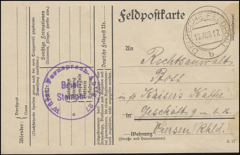 Carte postale de champ Württemb. Département de la langue de fer 27 FRANÇAIS FELDPOST 10.8.17 n. Viersen