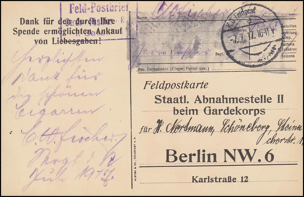 Carte postale de champ / carte de don B.S. Garde-Fusilier-Reg. Feldpost 7.7.17 n. Berlin