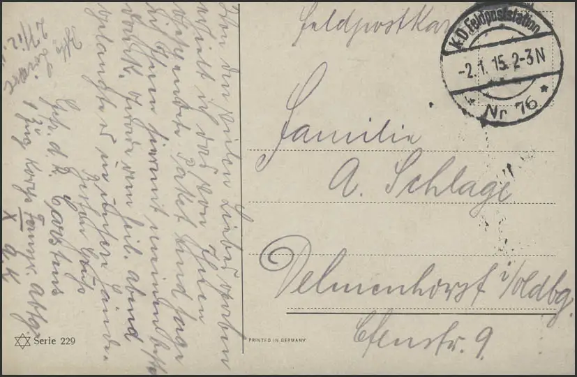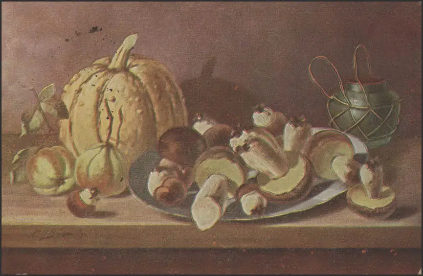 Carte postale de champignons et fruits peints, Poste de Champ 76, 2.2.15 par Delmenhorst