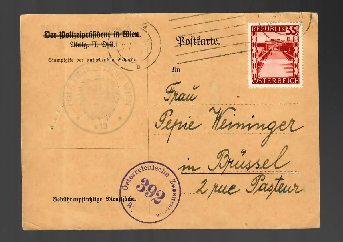Carte postale de la direction de police de Vienne à Bruxelles, censure 1946, EF no 755