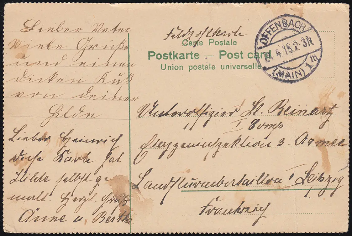 Carte postale de propagande enfant avec fusil OUFFENBACH 24.4.15 à l'adresse militaire