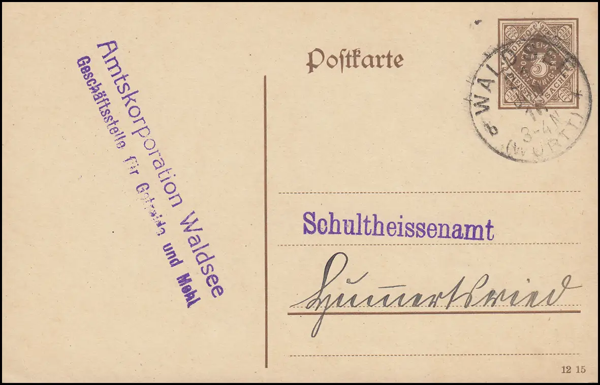Carte postale de service DP 11Ib/13 Paragraphe 3 Pf brun DV 1215, WALDSEE (WURTT.) 21.6.1916