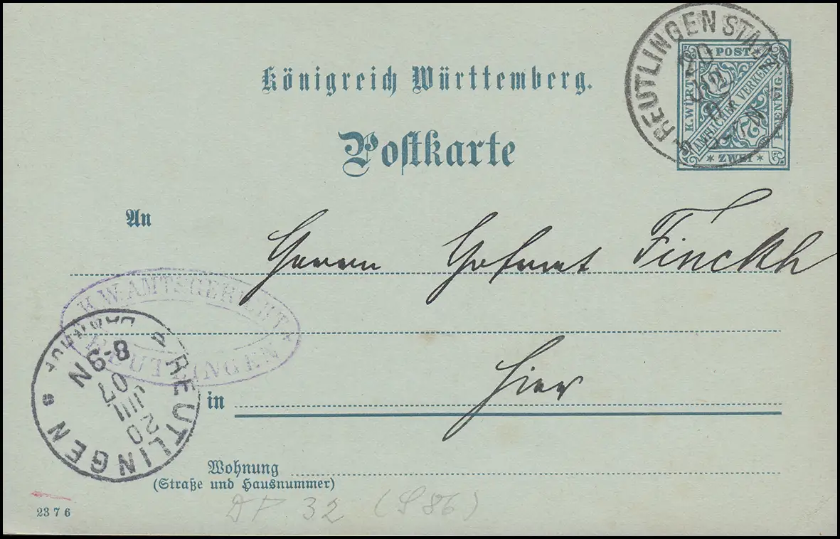 avec mention sur papier / DV 23 7 6, comme carte postale locale avec cachet d'arrivée cachet en cercle REUTLINGEN BAHNHOF 20.7.1907 N° de catalogue: DP32/11 Vérification: original Numéro d ' article: 00000000035058