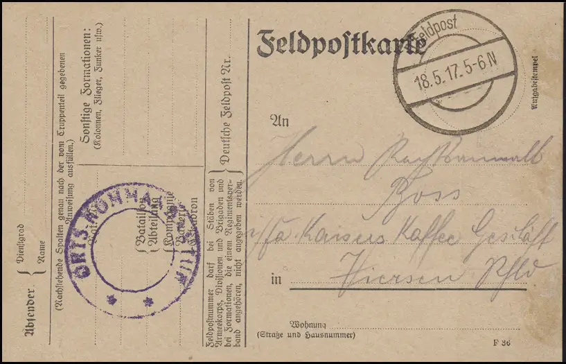 Carte postale de terrain COMMANDANTURE D'ORTS 18.5.17 à Viersen/Rhld.
