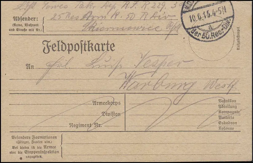 Carte postale de terrain K.D. Postexp. 50. Division de réserve 10.6.15 à Warburg