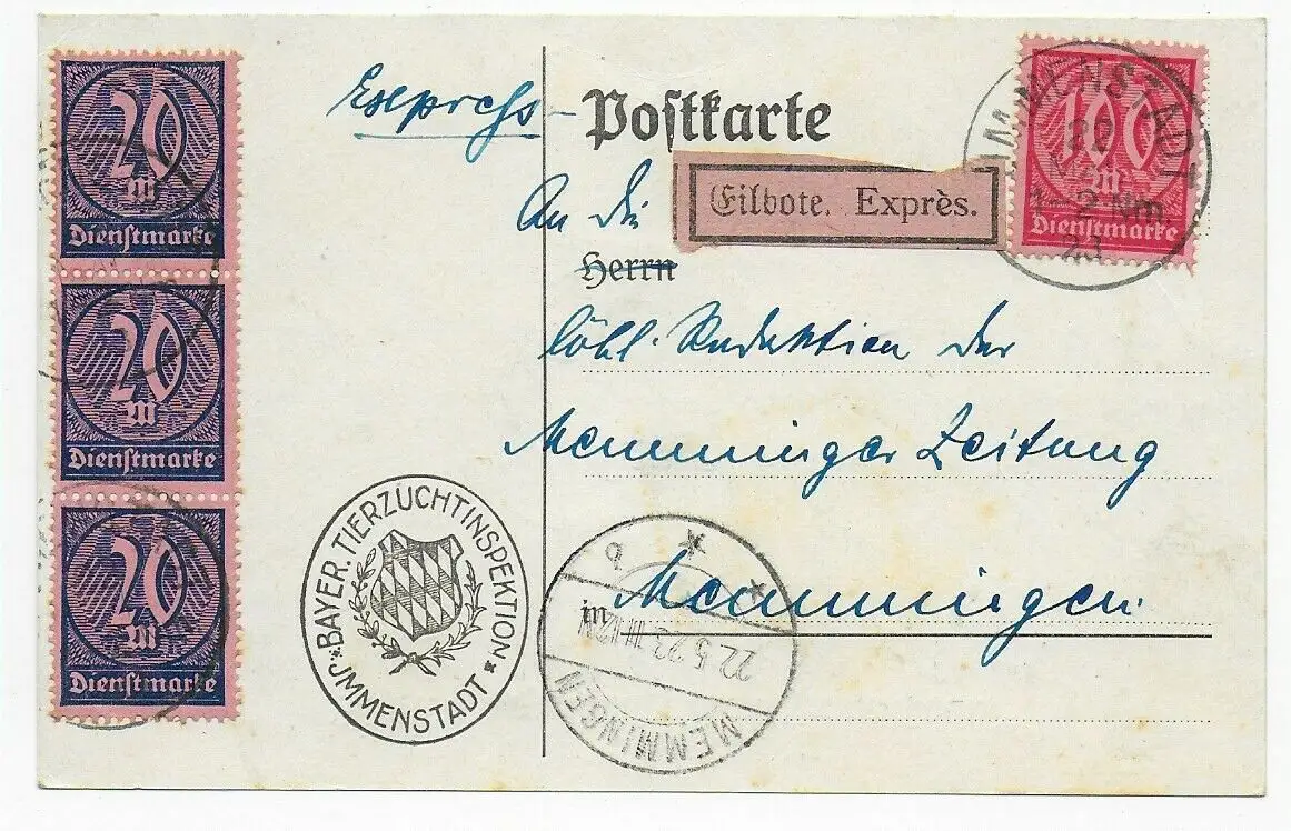 Carte postale en tant que messager, Bayr. Inspection zootechnique Immenstadt, 22.5.1923