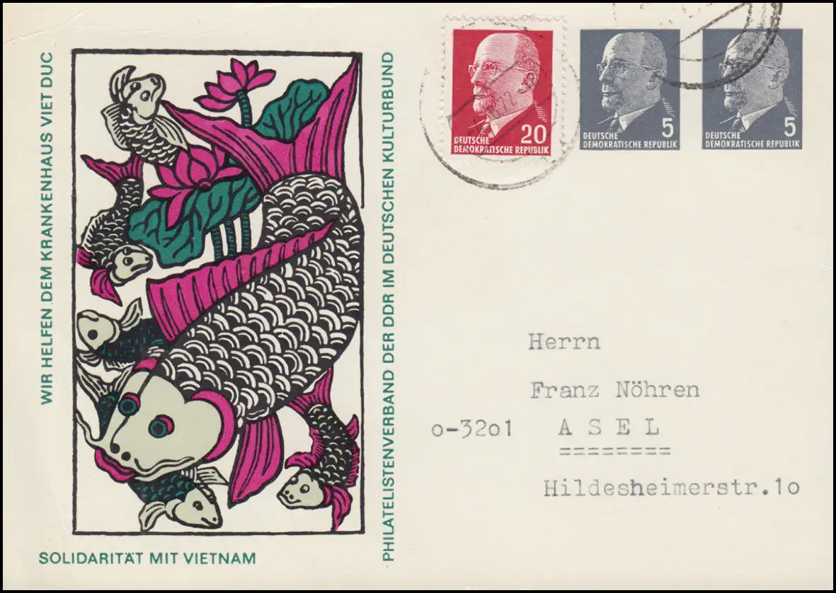 Carte postale privée PP 11/38a Ulbricht 5+5 Vietnam: Carpe, délai supplémentaire 4.6.72
