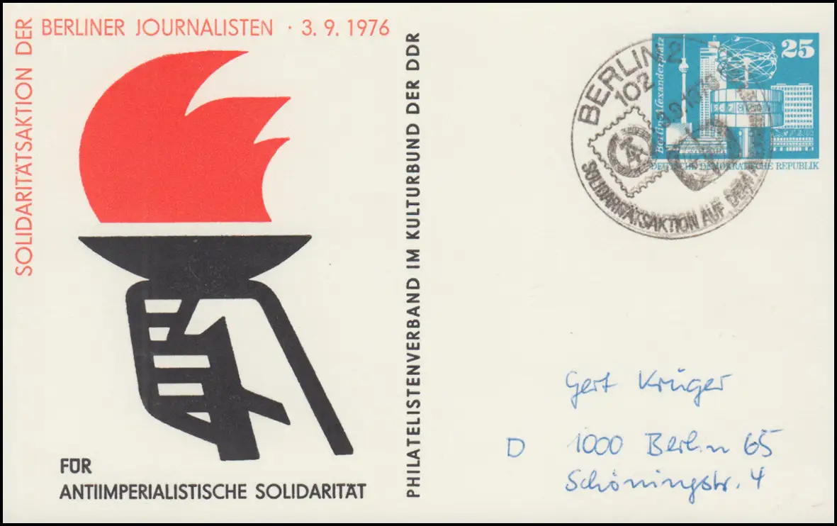 Carte postale privée PP 16/9 Solidarité des journalistes berlinois, SSt BERLIN 3.9.1976