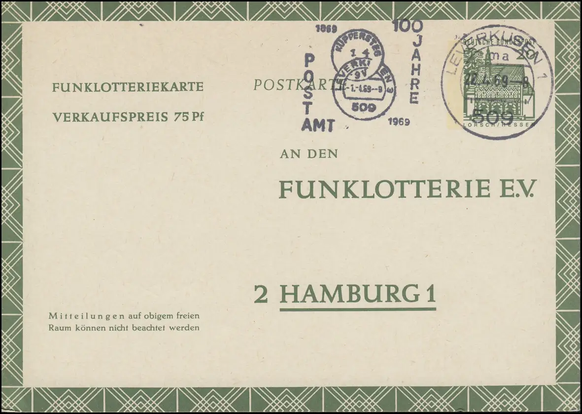 Carte postale radio-lotte FP 12 timbres promotionnels 100 ans Bureau de poste LEVERKUSEN 22.4.1969