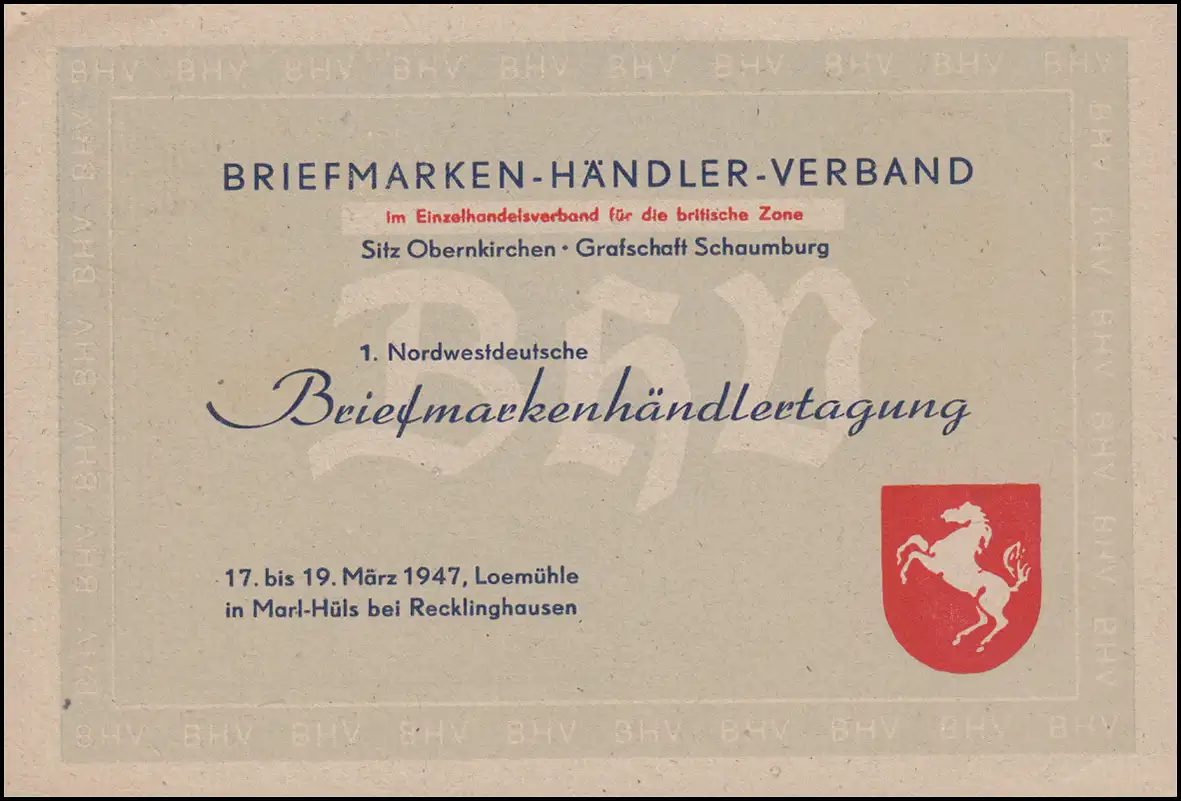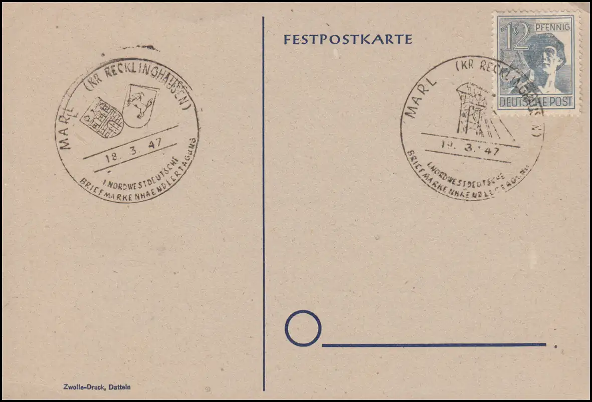 Carte postale spéciale MARL 1er congrès des marchands de timbres du nord-ouest de l'Allemagne 18-19.3.1947