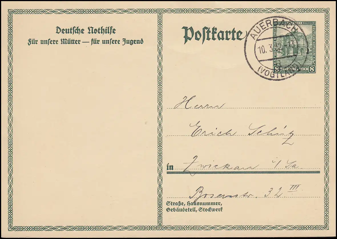 Carte postale spéciale P 212II Aide d'urgence Dresdner Zwinger AuerBACH / VOGTLAND 10.3.32