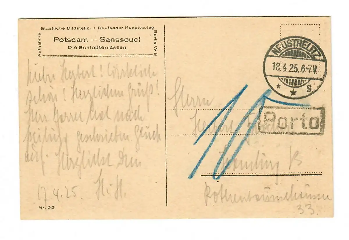 Carte sanssouci, 1925 Neustrelitz vers Hambourg, après-porto