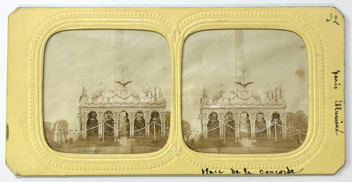 Les vues stéréoscopiques "french tissues" sont appelées ainsi parce qu'une fine feuille de soie colorée est insérée à l'arrière du tirage albuminé permettant de voir la vue en couleur en la regardant à la lumière.