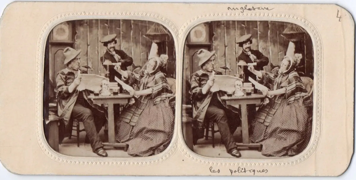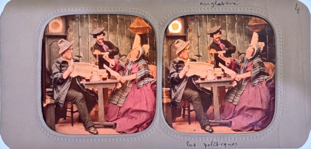 Les vues stéréoscopiques "french tissues" sont appelées ainsi parce qu'une fine feuille de soie colorée est insérée à l'arrière du tirage albuminé permettant de voir la vue en couleur en la regardant à la lumière.