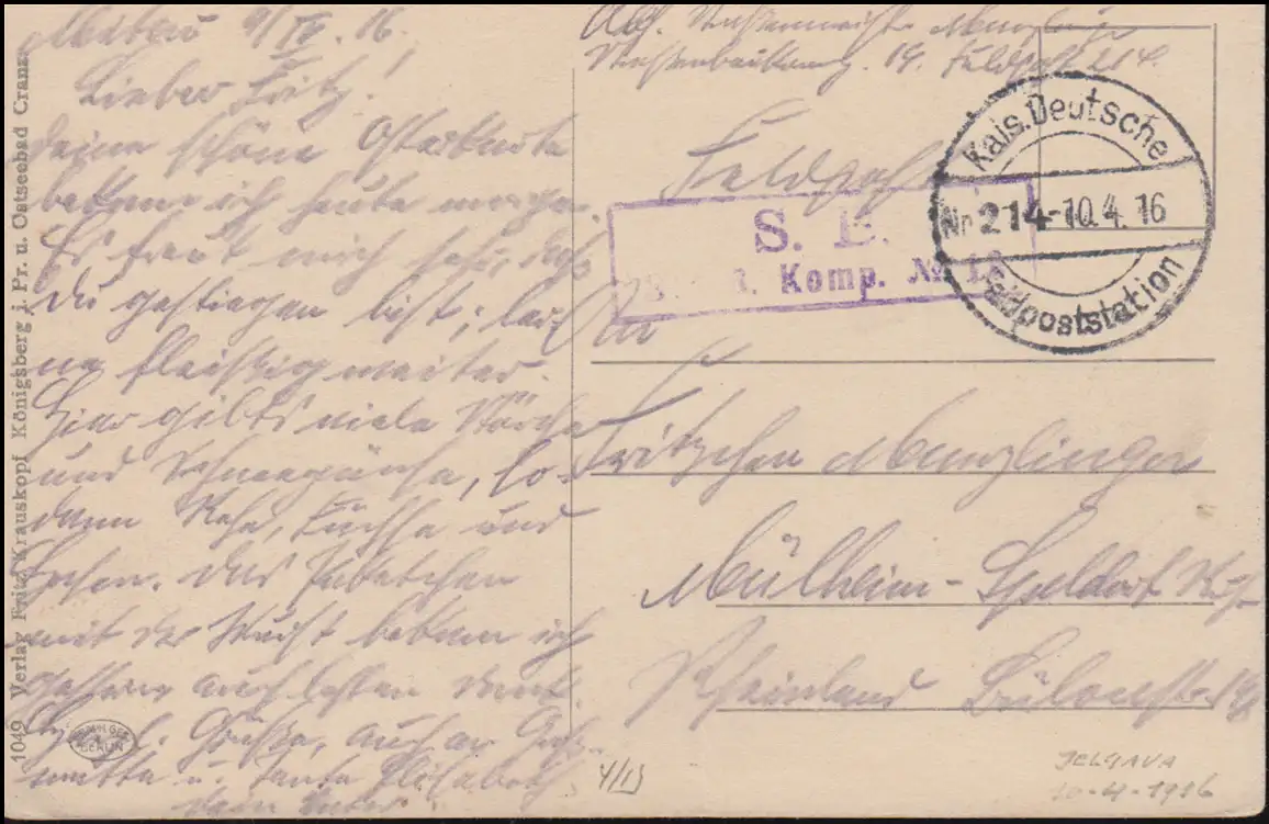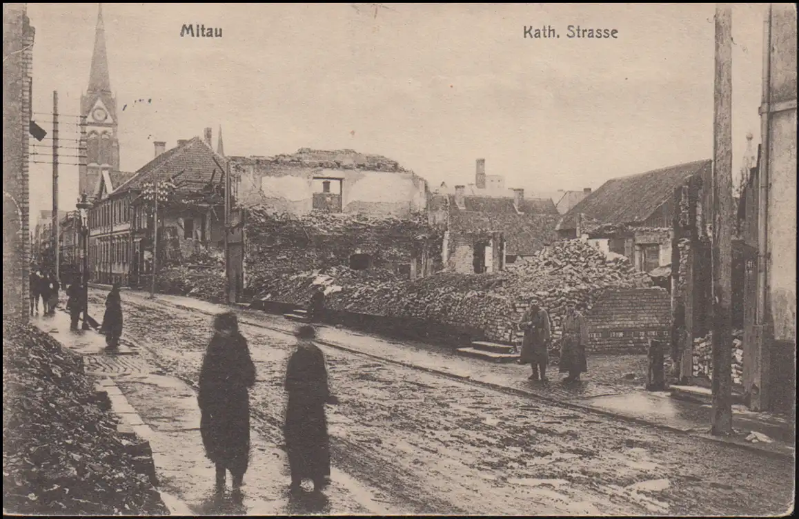 Carte visuelle La rue Mitau Kath. détruite, comme un poste de champ 214 - 10.4.1916