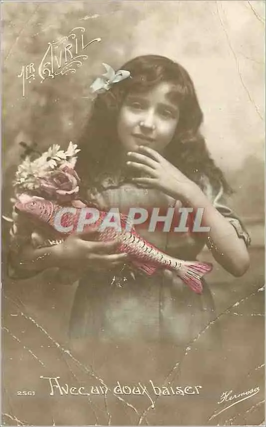 Cartes postales 1er Avril Avec un Doux Baiser Enfant Poisson
