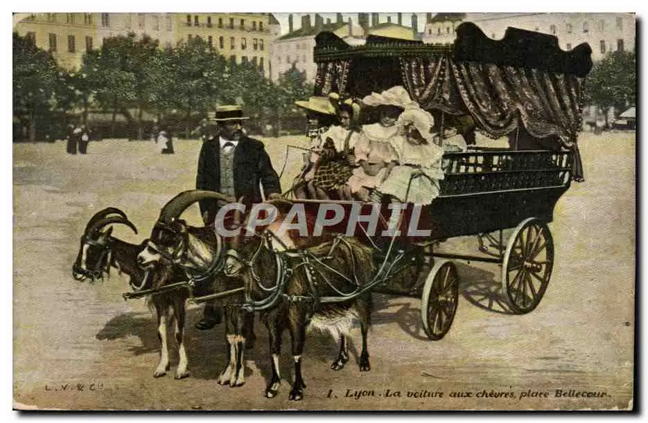 Cartes postales Attelage Lyon La voiture aux chevres place Bellecour Chevre TOP