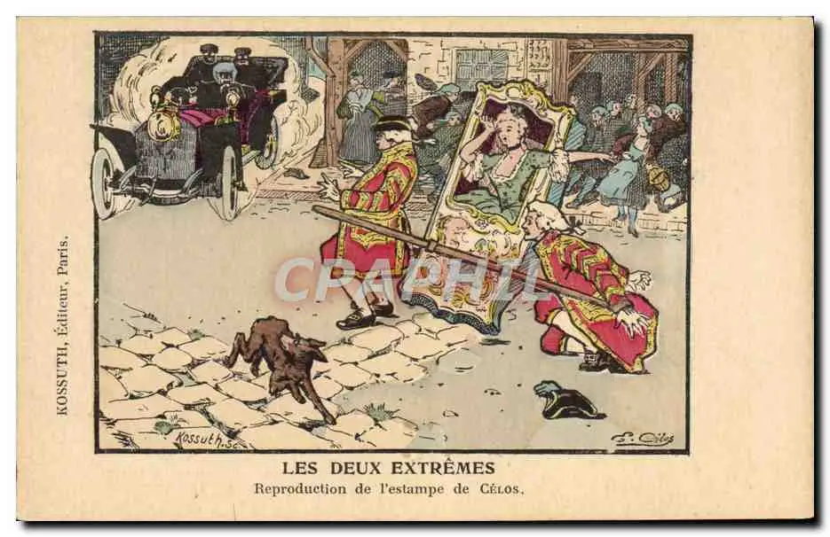 Cartes postales Automobile Les deux extremes Estampe de Celos Illustrateur Kossuth