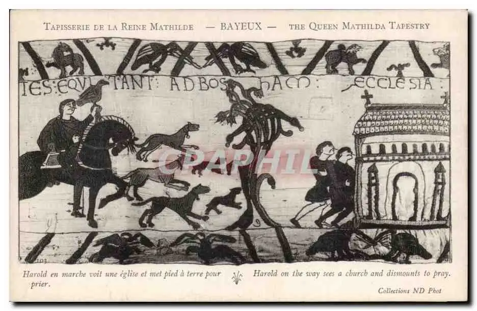 Cartes postales Bayeux Tapisserie de la Reine Harold en marche voit une eglise et met pied a terre pour prier
