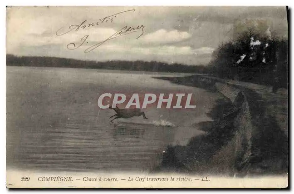 Cartes postales Chasse a courre Compiegne Le cerf traversant la riviere