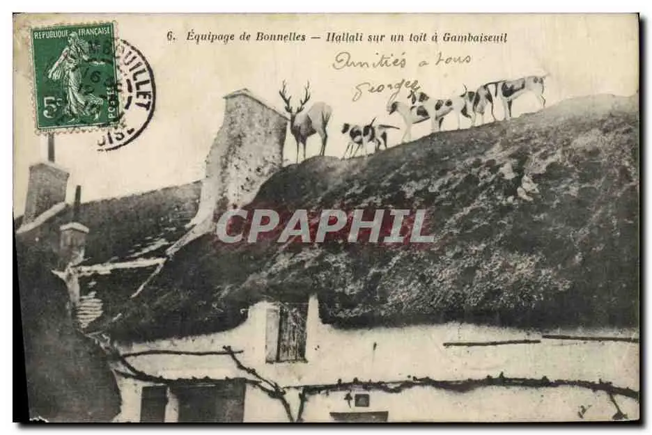 Cartes postales Chasse a courre Equipage de Bonnelles Hallali sur un toit a Gambaiseuil Chien Chiens