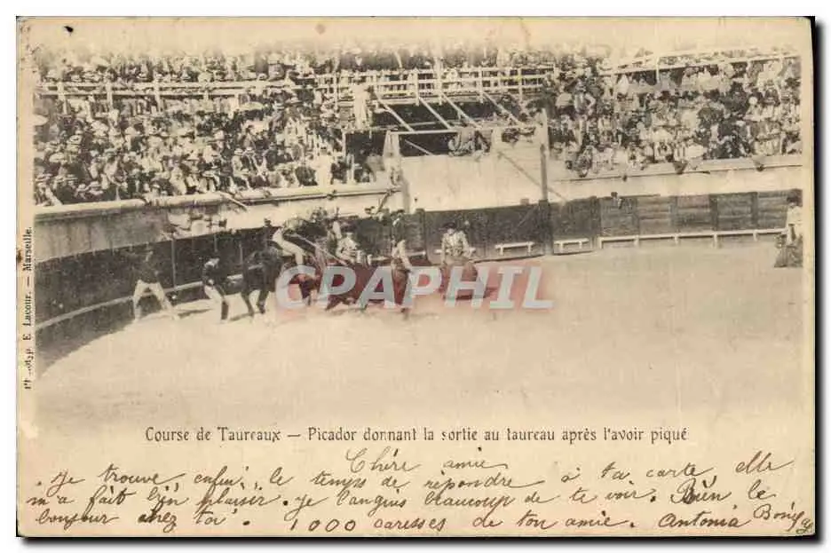 Cartes postales Corrida Course de taureaux Picador donnant la sortie au taureau apres l'avoir pique
