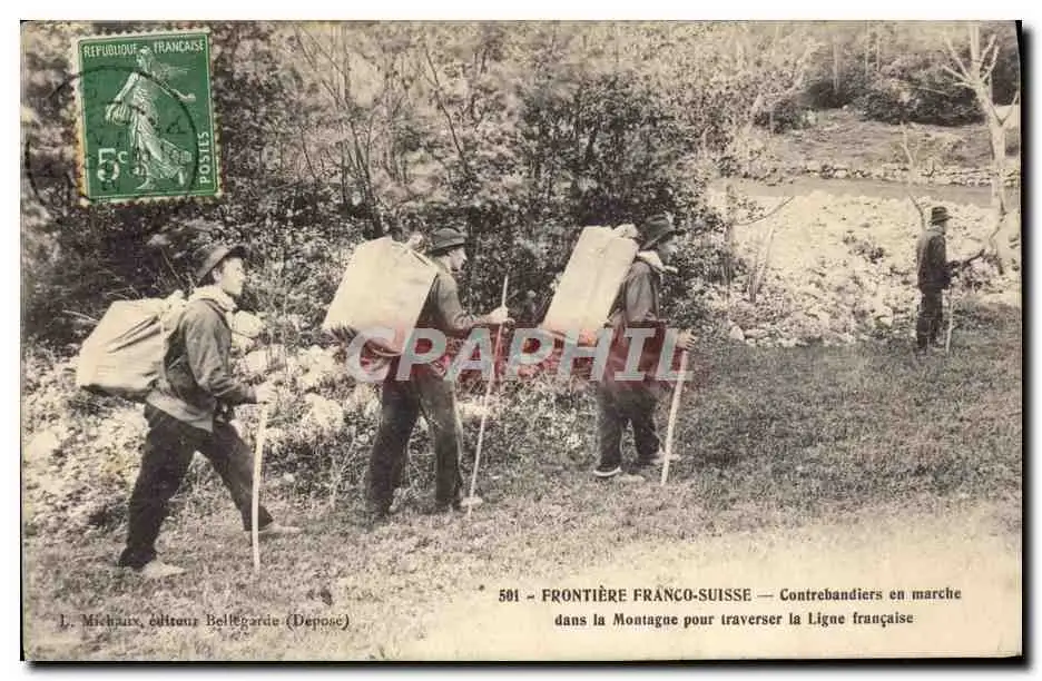 Cartes postales Douanes Douaniers Frontiere franco suisse Conrebandiers en marche dans la montagne