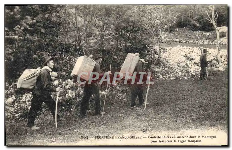 Cartes postales Douanes Frontiere Franco suisse Contrebandiers en marche dans la montagne pour traverser la lign