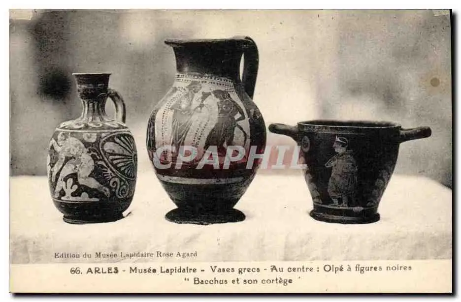 Cartes postales Faience Faincerie Arles Musee lapidaire Vases grecs Olpe a figures noires Bacchus et son cortege