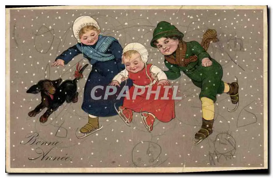 Cartes postales Fantaisie Enfants Patins a glace Chien